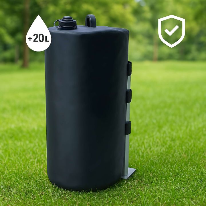 Capacidad de 20 litros – Al llenarse con agua, las pesas alcanzan un peso de 20 kg, lo que proporciona una estabilidad adecuada incluso con vientos fuertes.