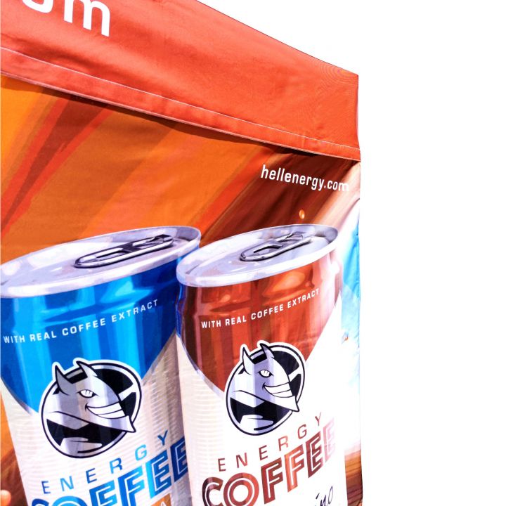 Carpas publicitarias con impresión digital por sublimación. La impresión se realiza mediante un proceso químico en el que la tinta, al someterse a alta temperatura, se adentra directamente en la estructura del tejido. Logotipo, texto o cualquier tipo de gráfico en el lado interior o exterior de la carpa, según los deseos del cliente.