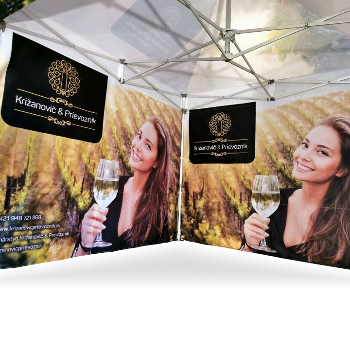 Carpas publicitarias con impresión digital por sublimación. La impresión se realiza mediante un proceso químico en el que la tinta, al someterse a alta temperatura, se adentra directamente en la estructura del tejido. Logotipo, texto o cualquier tipo de gráfico en el lado interior o exterior de la carpa, según los deseos del cliente.