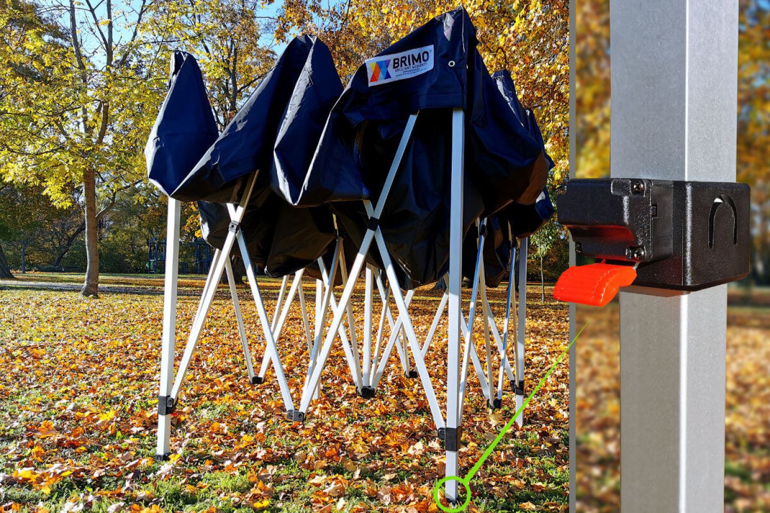 La carpa promocional resiste las condiciones climáticas con gran éxito. La carpa está sobre patas robustas que tienen bases gruesas. Cada base tiene dos agujeros para anclar rápidamente la carpa. La carpa siempre debe estar anclada. El kit incluye estacas de anclaje. Un techo rápido, una excelente presentación, fácil transporte, así resumiríamos la carpa de ventas más popular.