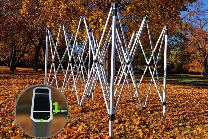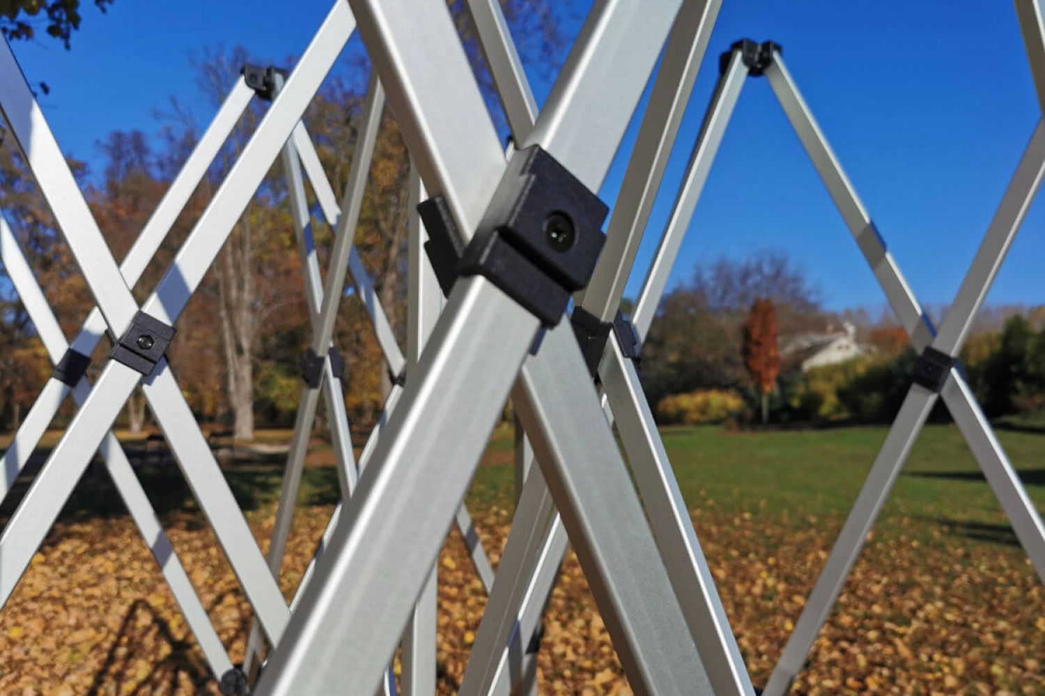 El material más utilizado es el aluminio. Tiene propiedades increíbles, es ligero pero muy resistente y fiable. Apreciarás su bajo peso si vendes frecuentemente bajo la carpa y necesitas transportarla. La carpa se monta y desmonta en pocos segundos.