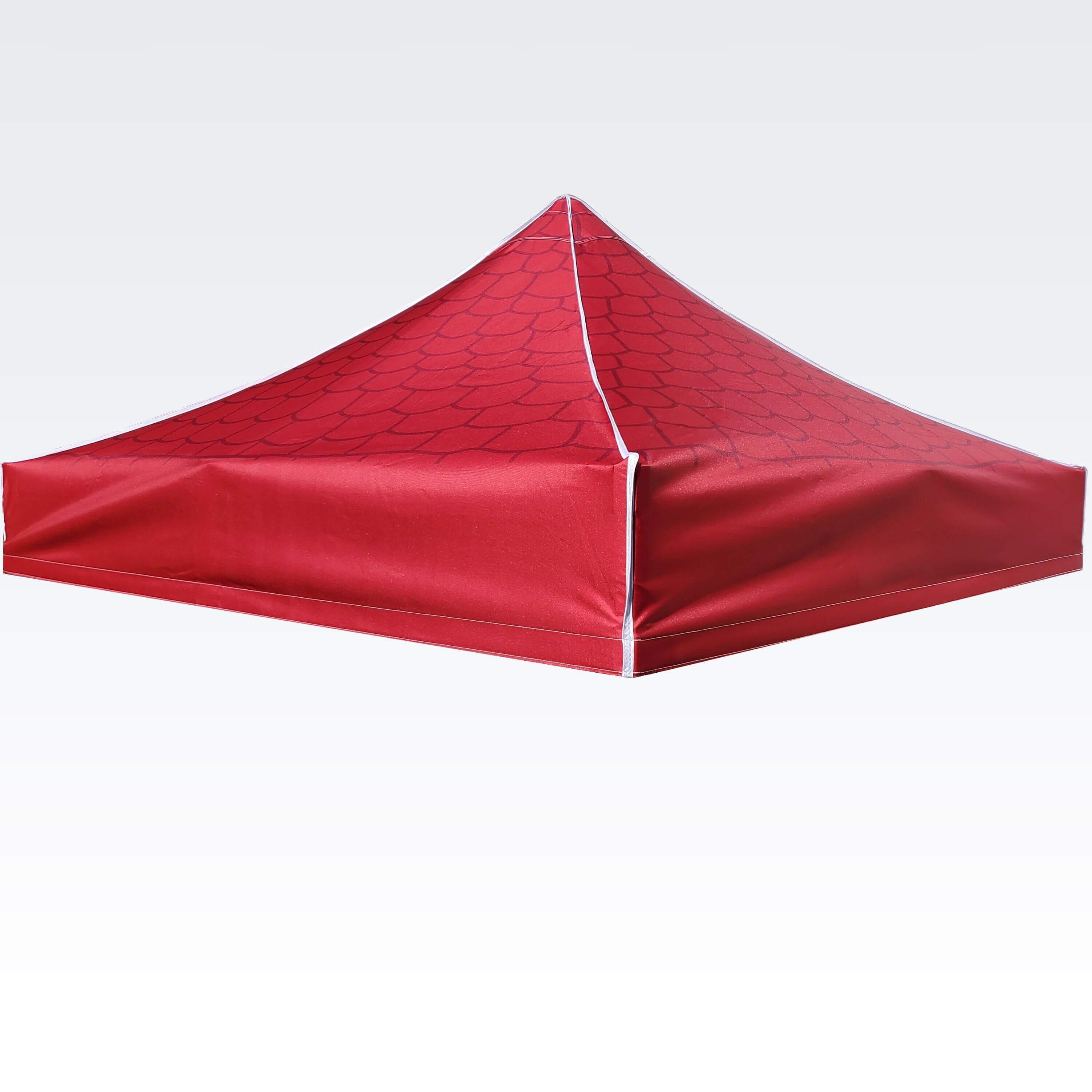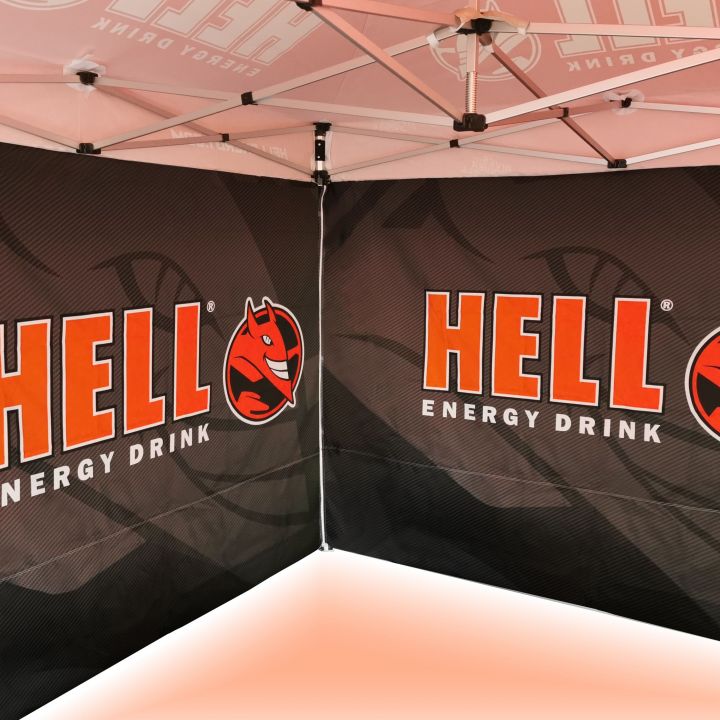 Carpas publicitarias con impresión digital por sublimación. La impresión se realiza mediante un proceso químico en el que la tinta, al someterse a alta temperatura, se adentra directamente en la estructura del tejido. Logotipo, texto o cualquier tipo de gráfico en el lado interior o exterior de la carpa, según los deseos del cliente.