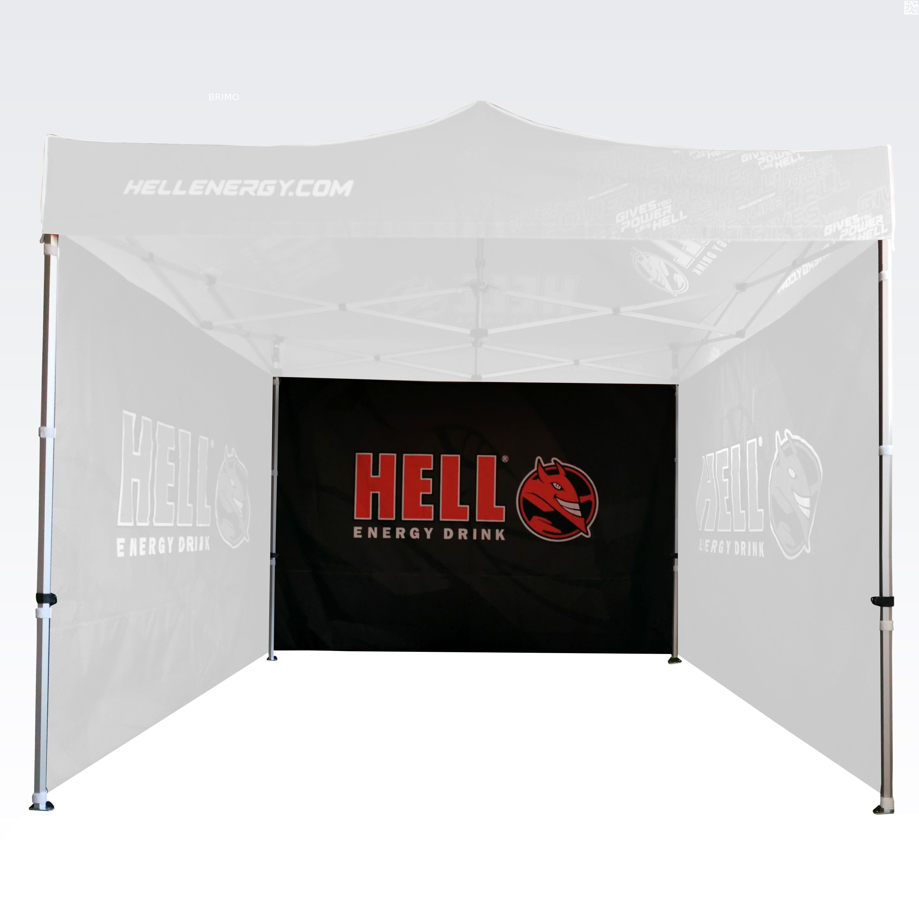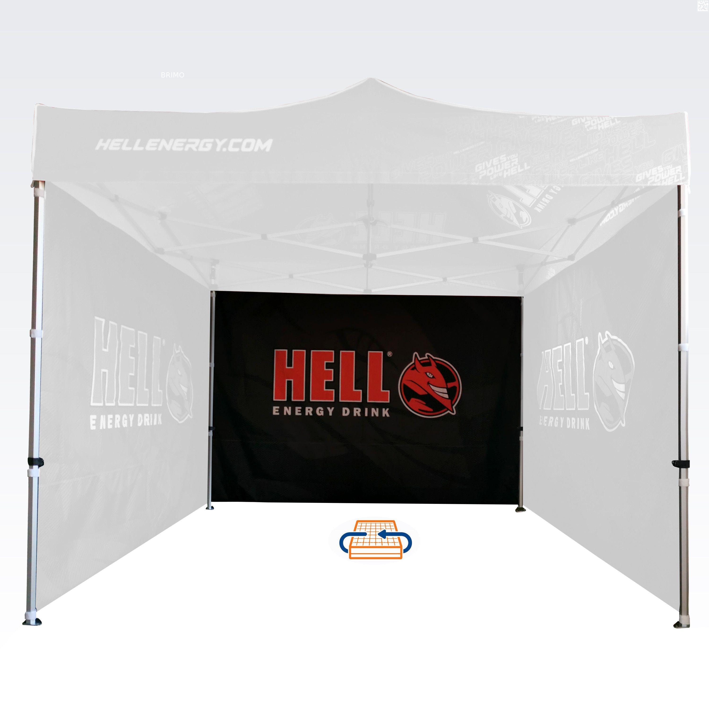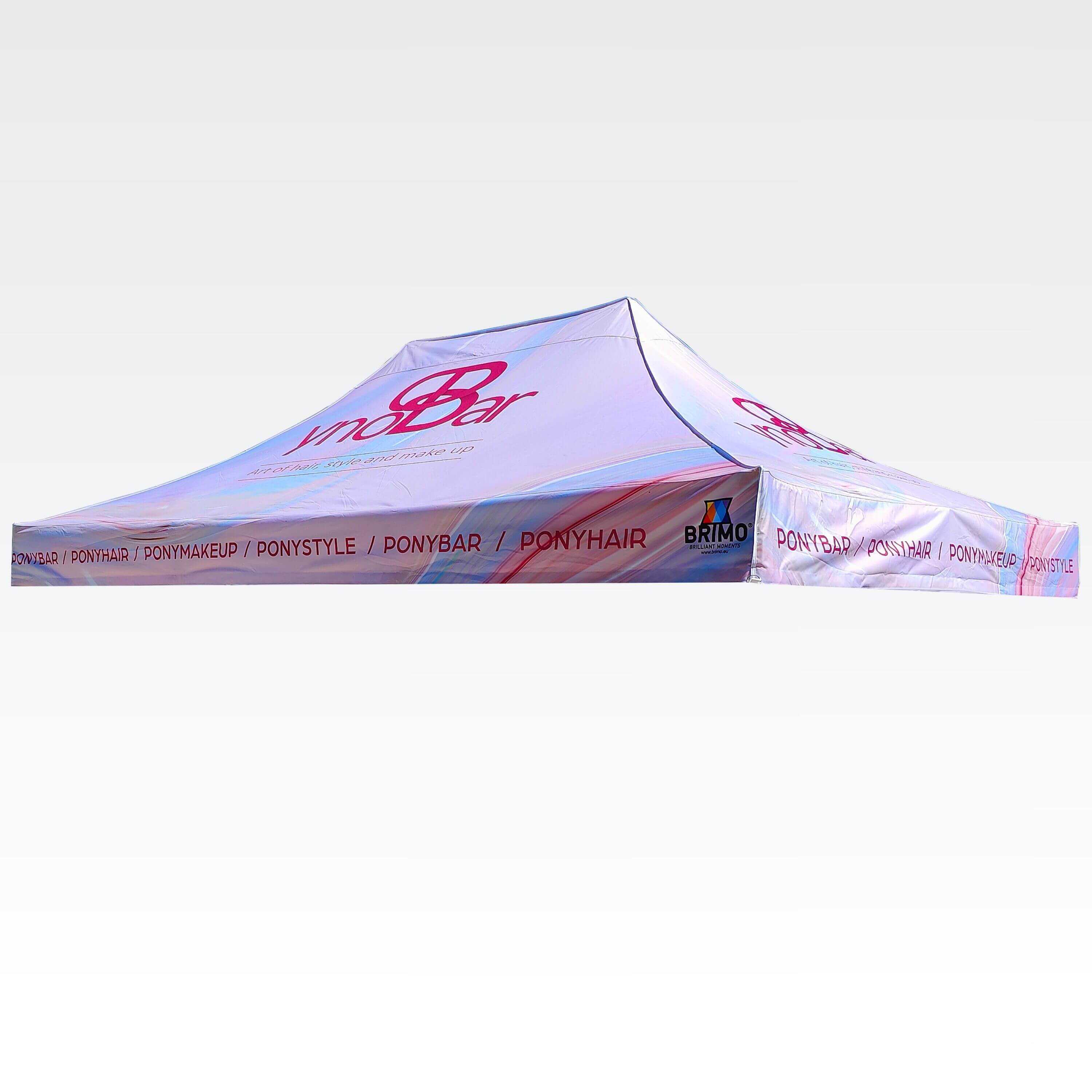 Carpas publicitarias con impresión digital por sublimación. La impresión se realiza mediante un proceso químico en el que la tinta, al someterse a alta temperatura, se adentra directamente en la estructura del tejido. Logotipo, texto o cualquier tipo de gráfico en el lado interior o exterior de la carpa, según los deseos del cliente.