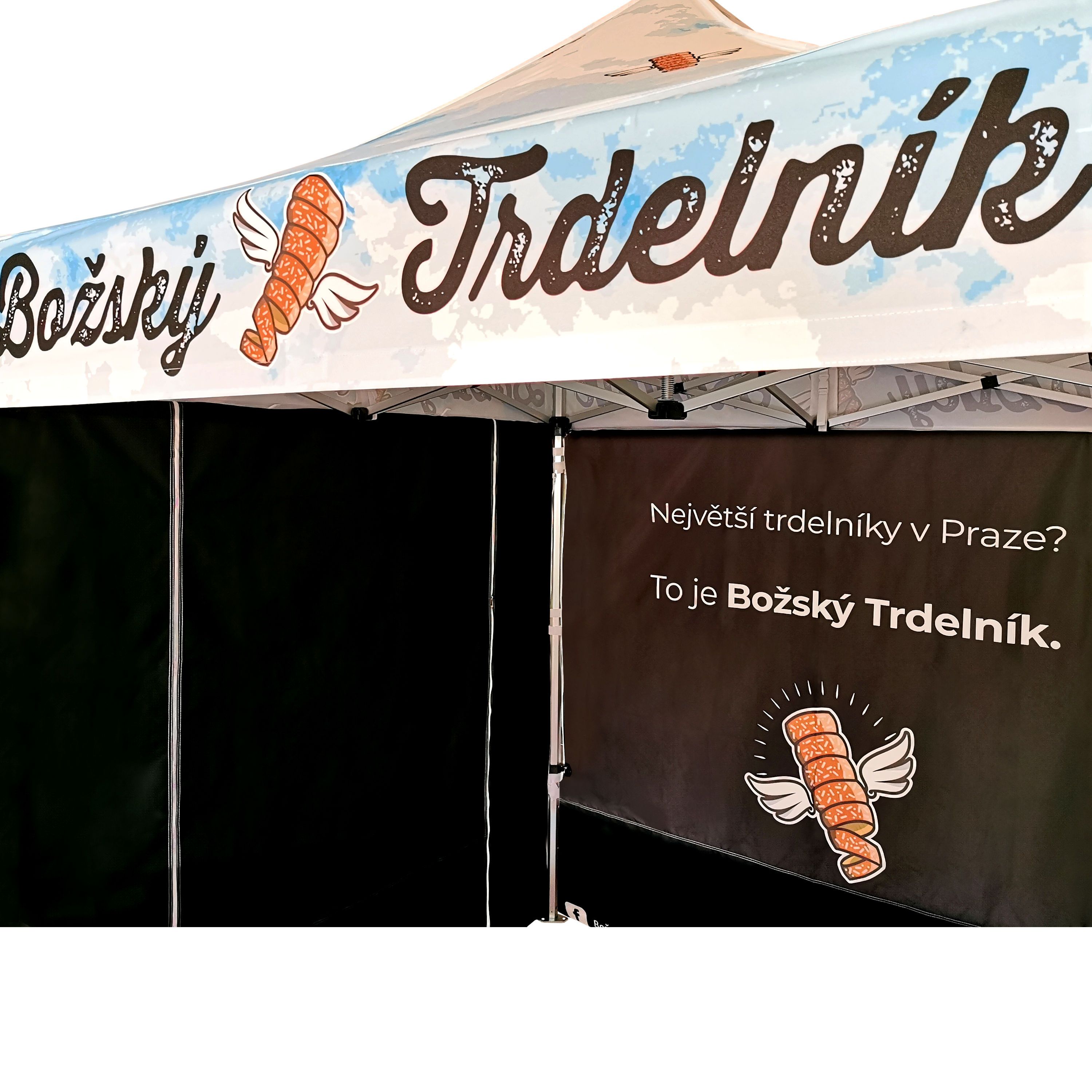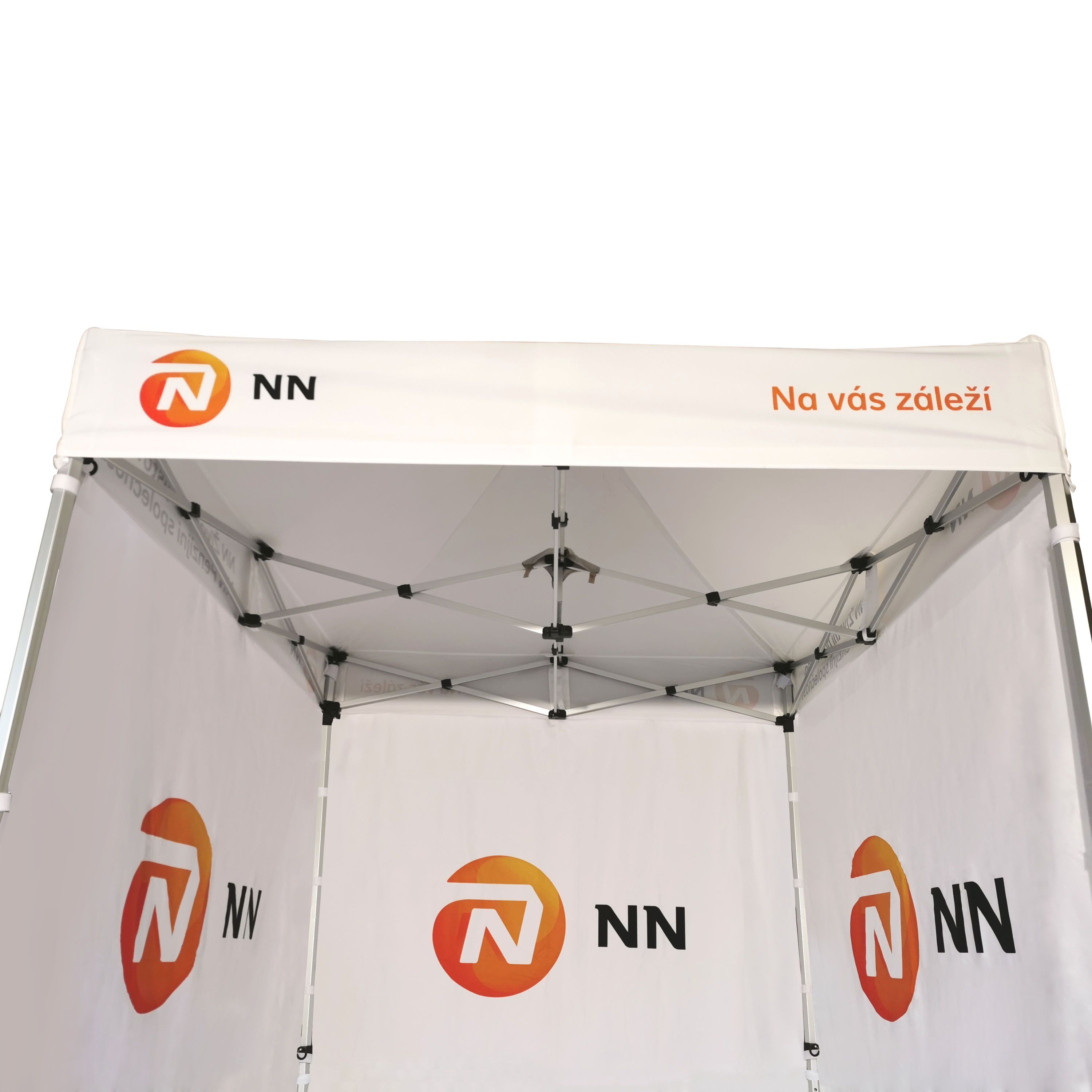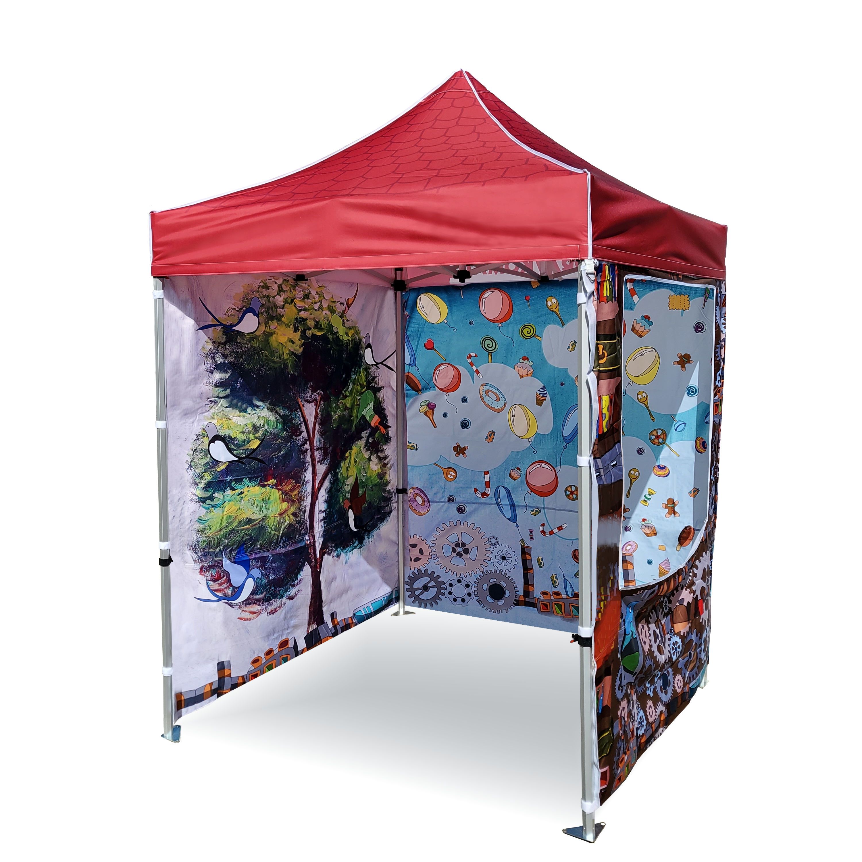 Carpas publicitarias con impresión digital por sublimación. La impresión se realiza mediante un proceso químico en el que la tinta, al someterse a alta temperatura, se adentra directamente en la estructura del tejido. Logotipo, texto o cualquier tipo de gráfico en el lado interior o exterior de la carpa, según los deseos del cliente.
