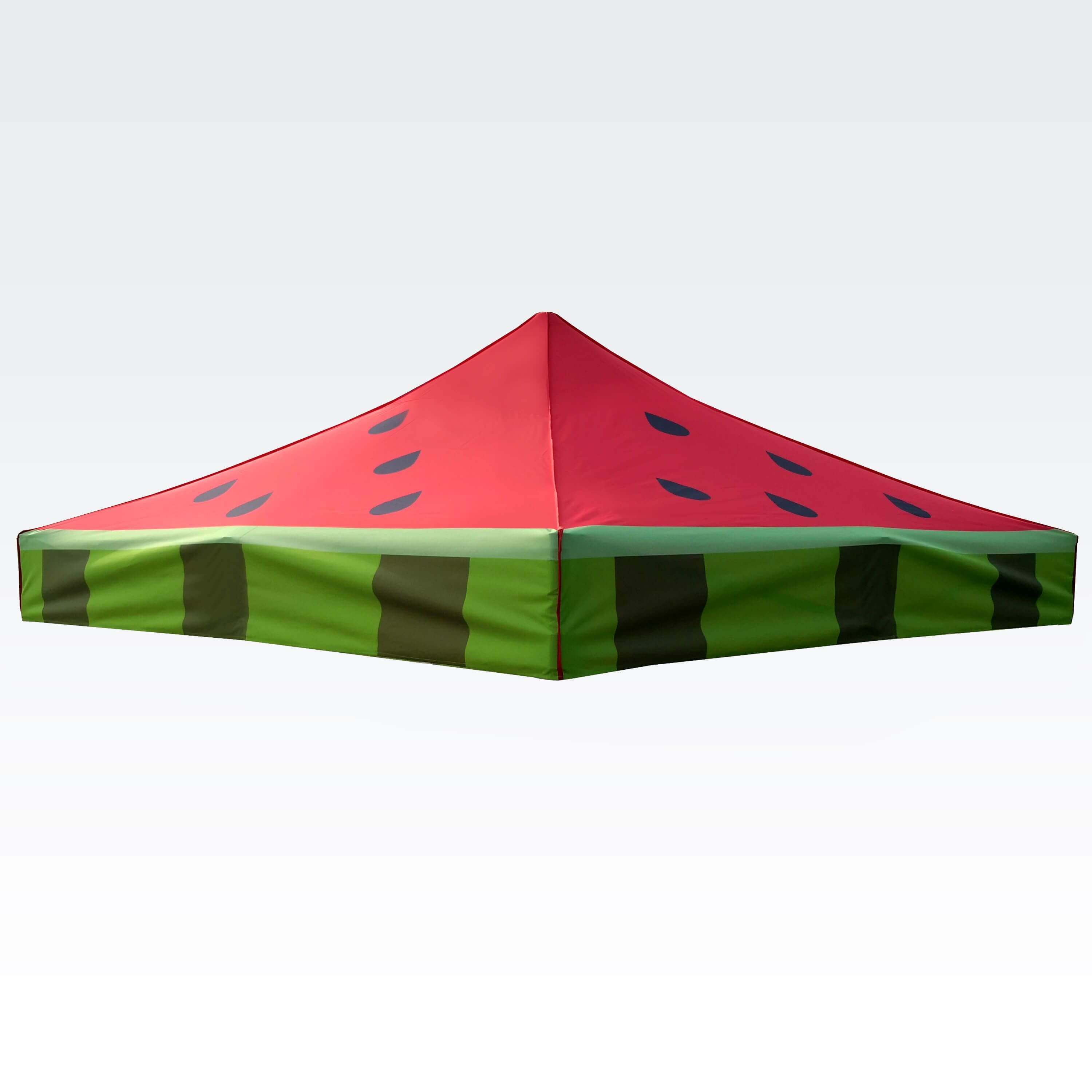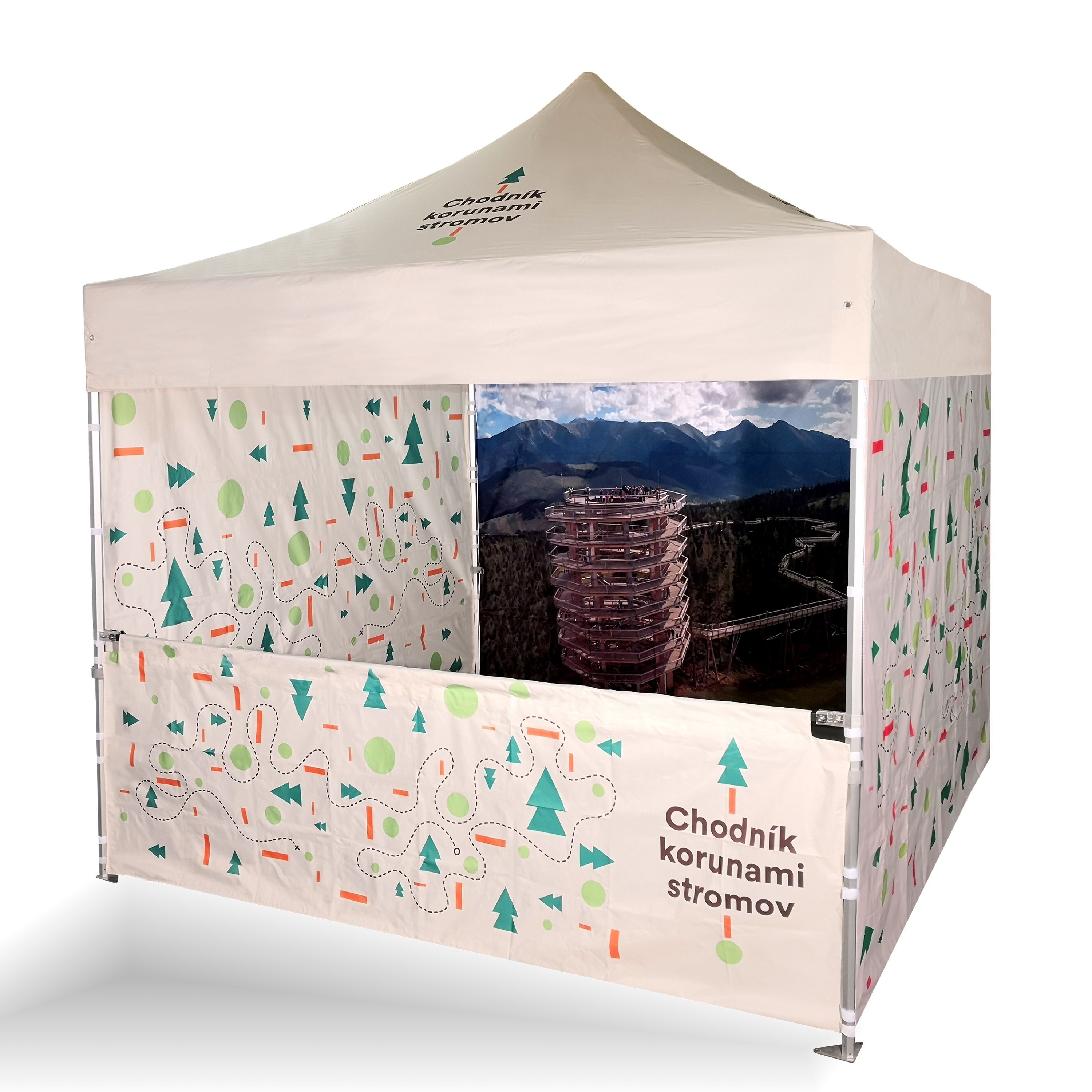 Carpas publicitarias con impresión digital por sublimación. La impresión se realiza mediante un proceso químico en el que la tinta, al someterse a alta temperatura, se adentra directamente en la estructura del tejido. Logotipo, texto o cualquier tipo de gráfico en el lado interior o exterior de la carpa, según los deseos del cliente.