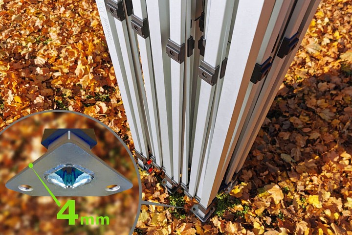 La carpa de jardín de aluminio puede usarse tanto en exteriores como en interiores. No subestimes la necesidad de asegurar la carpa. Siempre debe asegurarse en cualquier clima. El paquete incluye estacas para anclar. Si montas la carpa en una superficie dura, puedes usar pesos de acero o sacos de arena para anclarla. Como anclaje adicional, los clientes utilizan cuerdas con estacas, que también se pueden pedir como accesorios para la carpa.