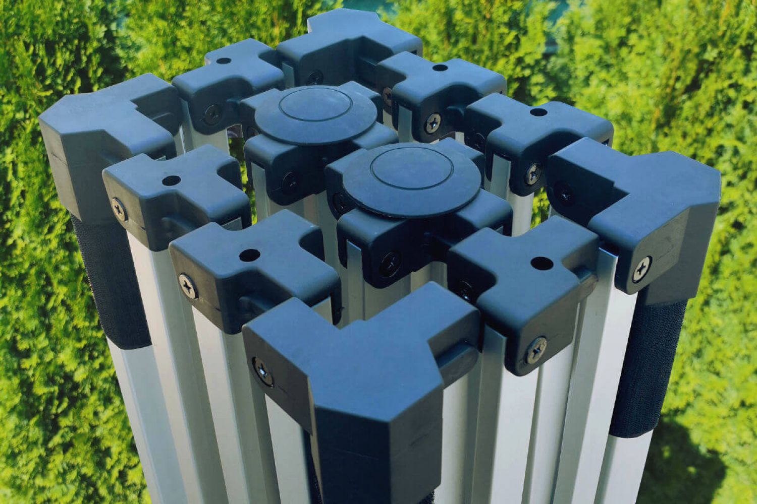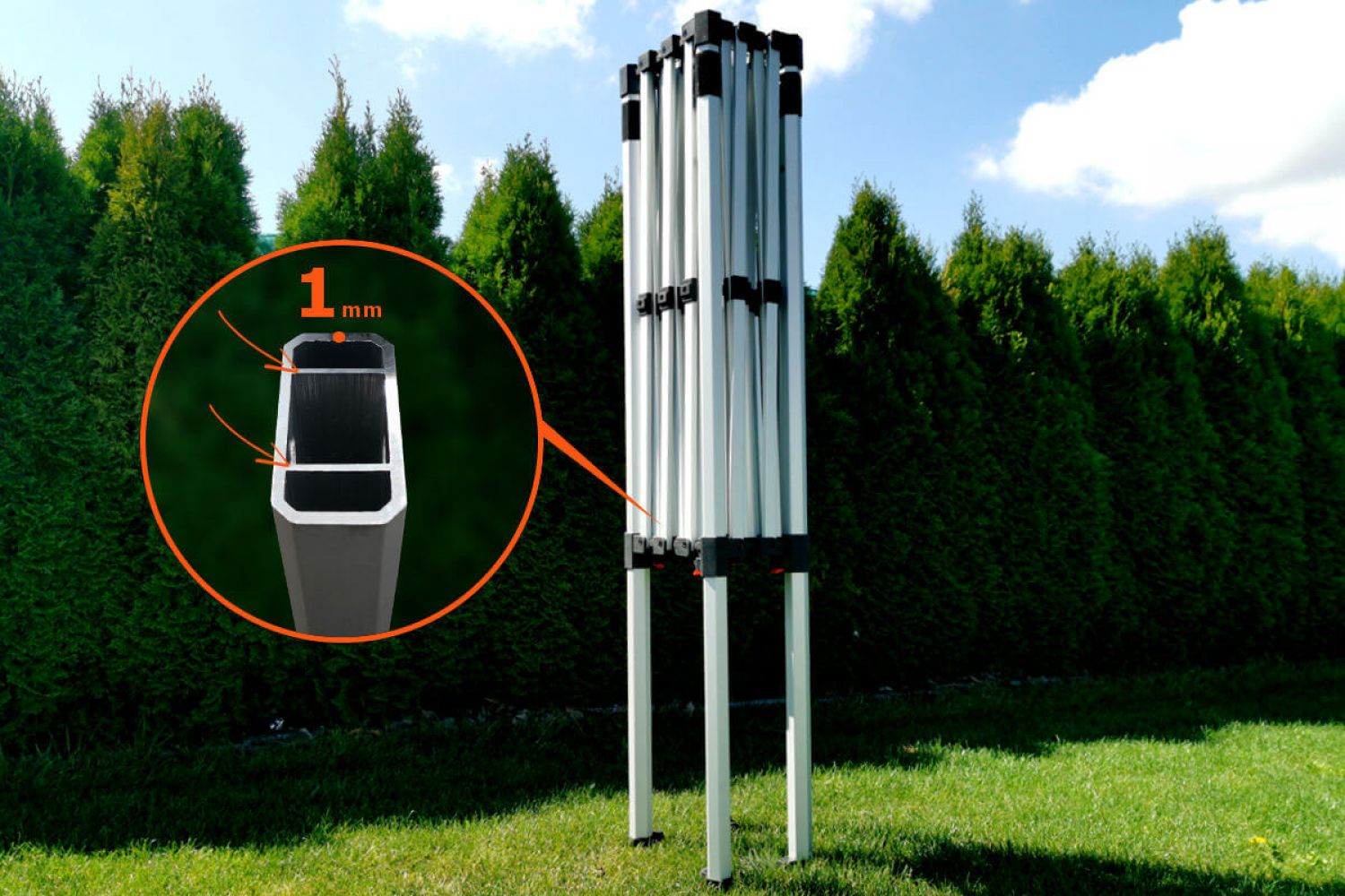 ¿Crear un espacio cubierto en pocos segundos? Con nuestra carpa es una realidad. El sistema de plegado automático es literalmente un juego de niños y cualquiera puede hacerlo sin herramientas. El tiempo ahorrado lo puede dedicar a decorar la carpa o preparar materiales promocionales. El corazón de la carpa es la ligera estructura de aluminio, que facilita el transporte y la manipulación.